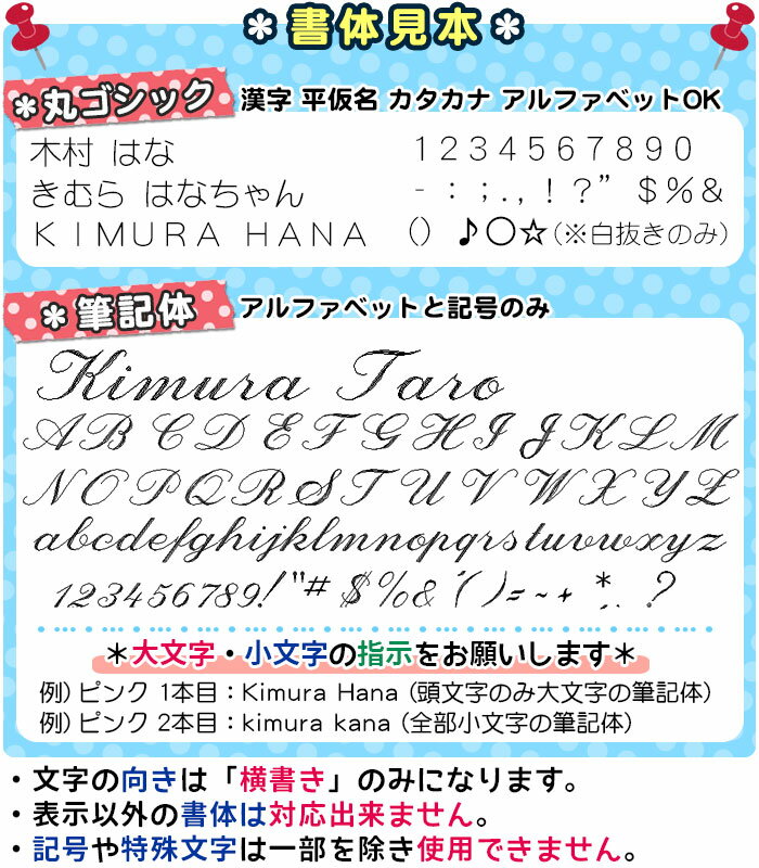 例1)ライトピンク 一本目:Kimura Hana (頭文字のみ大文字の筆記体) 例2)ピンク 一本目:kimura hana (全部小文字の筆記体) ※全て大文字でご指定された場合は頭文字のみ大文字、後は小文字で彫刻させて頂きます。